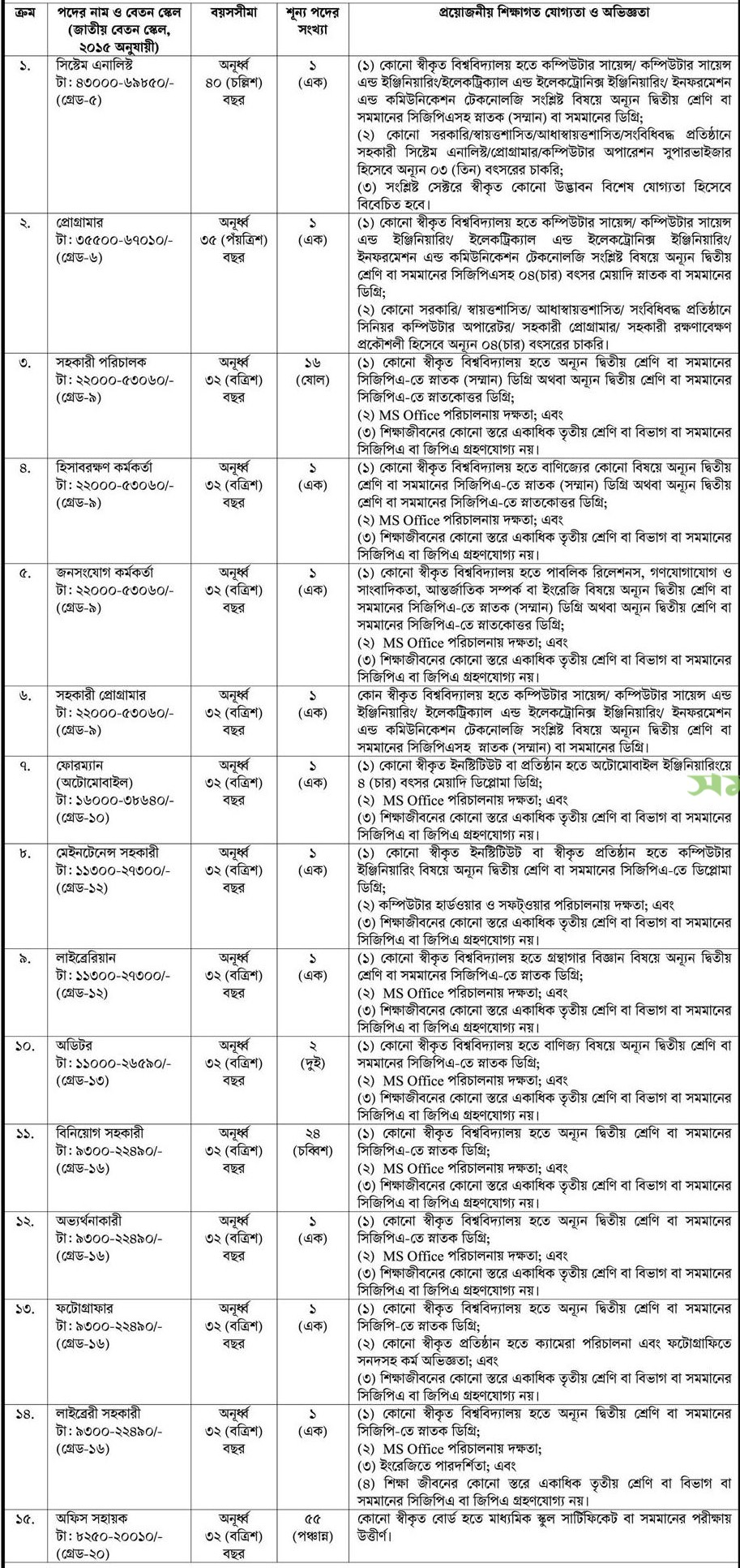 বয়স: ০১ মার্চ ২০২৫ তারিখে ০১ নং পদের জন্য ১৮-৪০ বছর, ০২ নং পদের জন্য ১৮-৩৫ বছর, ০৩-১৫ নং পদের জন্য ১৮-৩২ বছর। এসএসসি অথবা সমমান পরীক্ষার সনদ পত্রের ভিত্তিতে বয়স যাচাই করা হবে। বয়স প্রমাণের ক্ষেত্রে কোনো প্রকার এফিডেভিট গ্রহণযোগ্য হবে না।