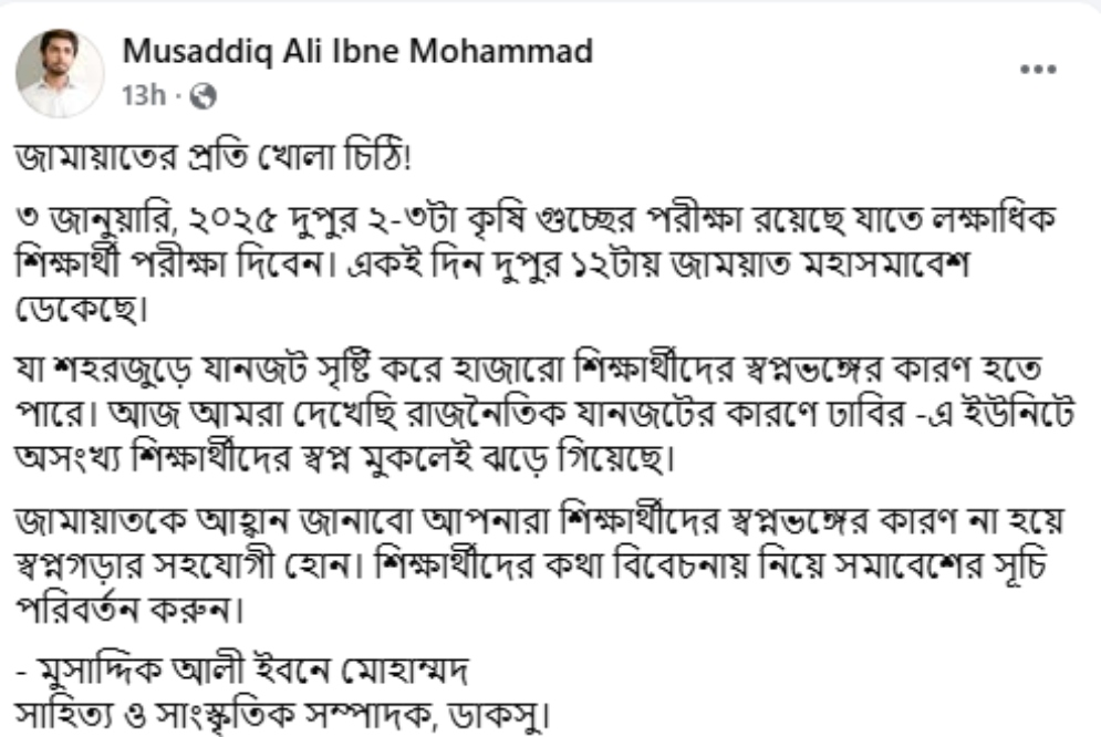 খোলা চিঠিতে তিনি জামায়াতে ইসলামীর প্রতি আহ্বান জানিয়ে বলেন, শিক্ষার্থীদের স্বপ্নভঙ্গের কারণ না হয়ে স্বপ্ন গড়ার সহযোগী হতে হবে। লক্ষাধিক শিক্ষার্থীর স্বার্থ বিবেচনায় নিয়ে ৩ জানুয়ারির মহাসমাবেশের সময়সূচি পুনর্বিবেচনা ও পরিবর্তনের অনুরোধ জানান তিনি।