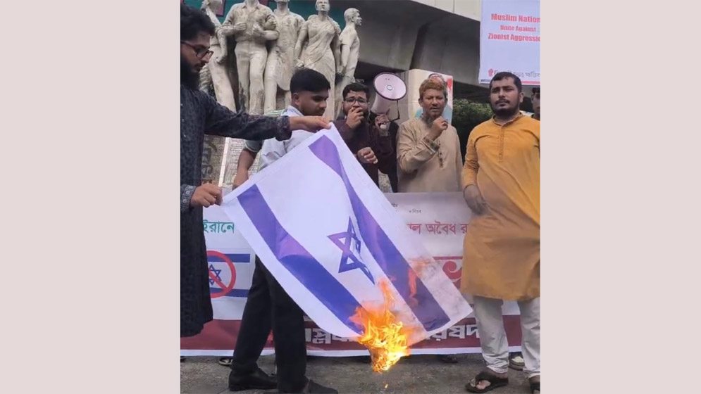 গাজা-ইরানে হামলার প্রতিবাদে ঢাবিতে ইসরাইলি পতাকায় অগ্নিসংযোগ