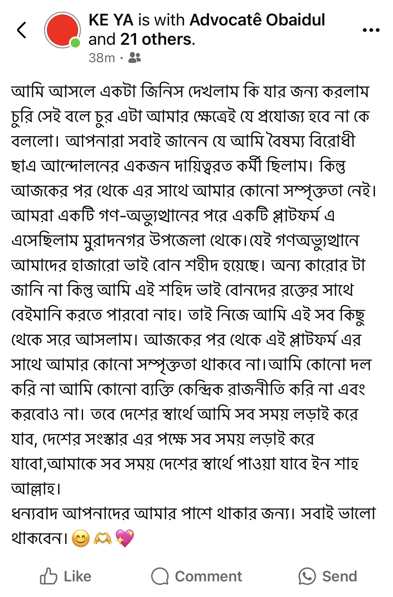 নিজের পোস্টে কেয়া লেখেন- ‘যার জন্য করলাম চুরি, সেই বলে চোর! এটা আমার ক্ষেত্রেই যে প্রযোজ্য হবে না, কে বলল? আপনারা সবাই জানেন আমি বৈষম্যবিরোধী ছাত্র আন্দোলনের একজন দায়িত্বশীল কর্মী ছিলাম; কিন্তু আজকের পর থেকে এ আন্দোলনের সঙ্গে আমার কোনো সম্পৃক্ততা নেই।’