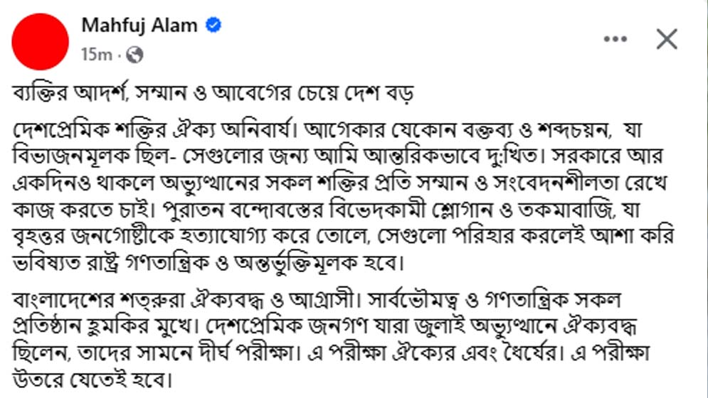 পোস্টে মাহফুজ আলম লেখেন, দেশপ্রেমিক শক্তির ঐক্য অনিবার্য। আগেকার যেকোনো বক্তব্য ও শব্দচয়ন, যা বিভাজনমূলক ছিল-সেগুলোর জন্য আমি আন্তরিকভাবে দু:খিত। সরকারে আর একদিনও থাকলে অভ্যুত্থানের সব শক্তির প্রতি সম্মান ও সংবেদনশীলতা রেখে কাজ করতে চাই।