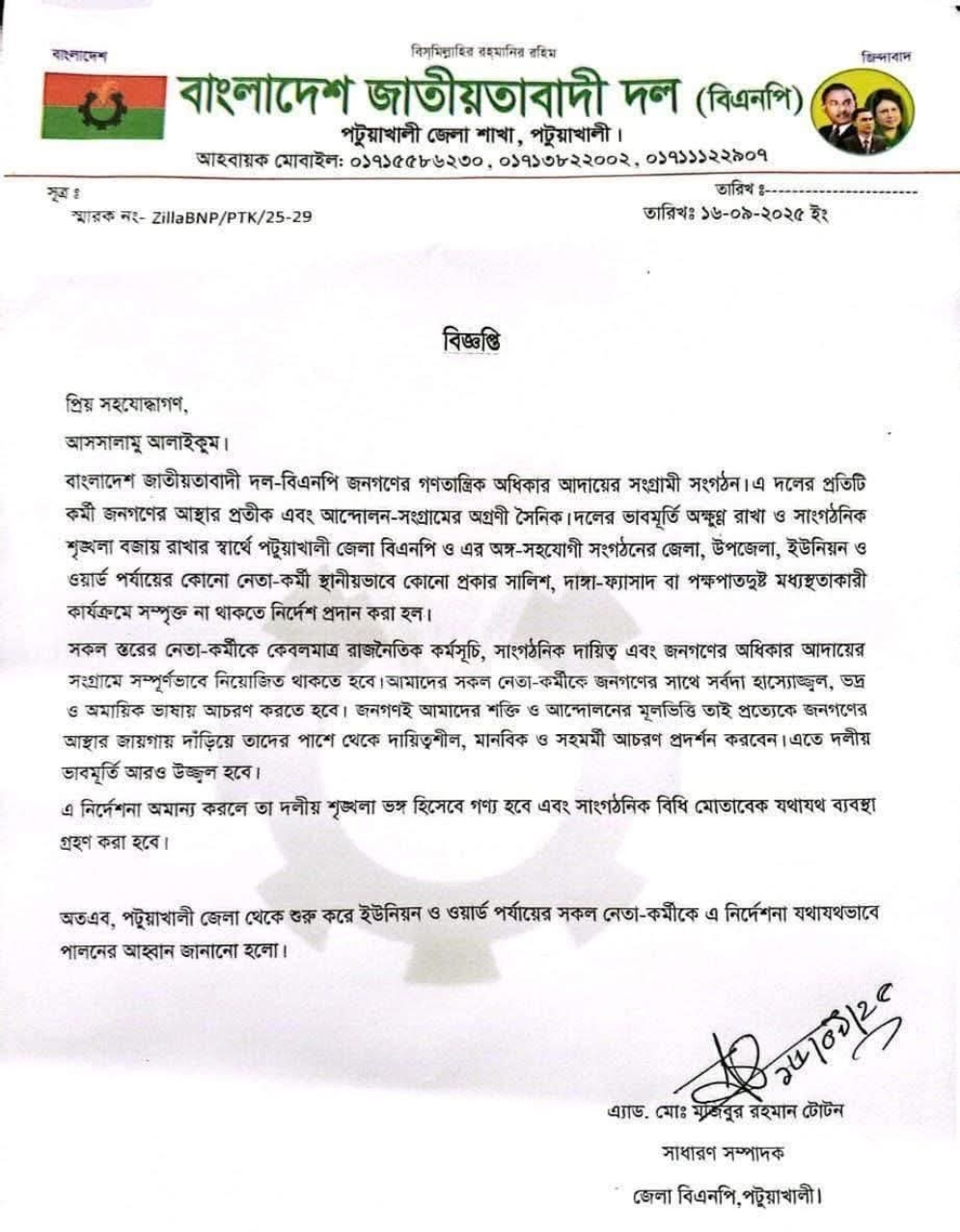 এই নির্দেশনার মাধ্যমে পটুয়াখালী জেলা বিএনপি দলীয় নেতাকর্মীদের মাঝে শৃঙ্খলা বজায় রাখার পাশাপাশি একটি সুশৃঙ্খল রাজনৈতিক চর্চার দৃষ্টান্ত স্থাপন করতে চায়। সময়ই বলে দেবে, এই নির্দেশনা মাঠপর্যায়ে কতটা বাস্তবায়ন হয় এবং দলের ভাবমূর্তি রক্ষায় কতটা কার্যকর প্রভাব ফেলবে।
