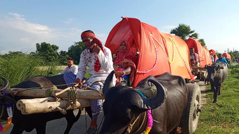 শুক্রবার দুপুরের দিকে খাকড়তলা গ্রামের মেঠোপথ ধরে এগোচ্ছে ঘোড়ার গাড়ি, পেছনে গরু-মহিষের গাড়ির লম্বা বহর। বরযাত্রীদের কেউ পাঞ্জাবি পরে, কারও মাথায় গামছা জড়ানো। আশপাশের গ্রামের মানুষ দলে দলে রাস্তার ধারে দাঁড়িয়ে দেখছে—স্মার্টফোনে ছবি তুলছে, ভিডিও করছে।