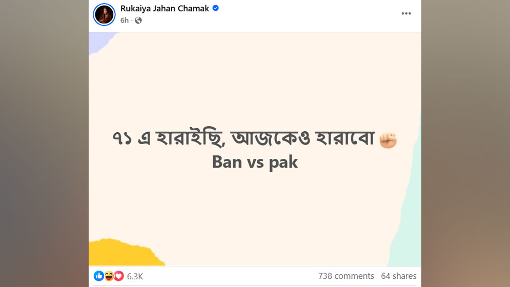 বৃহস্পতিবার (২৫ সেপ্টেম্বর) ছোটপর্দার জনপ্রিয় অভিনেত্রী রুকাইয়া জাহান চমক এক পোস্টের মাধ্যমে দেশের ক্রিকেটার উজ্জীবিত করেছেন। অভিনেত্রী লেখেন, ‘৭১ এ হারাইছি, আজকেও হারাব।’ এরপর তিনি উল্লেখ করে দেন, বাংলাদেশ বনাম পাকিস্তান।