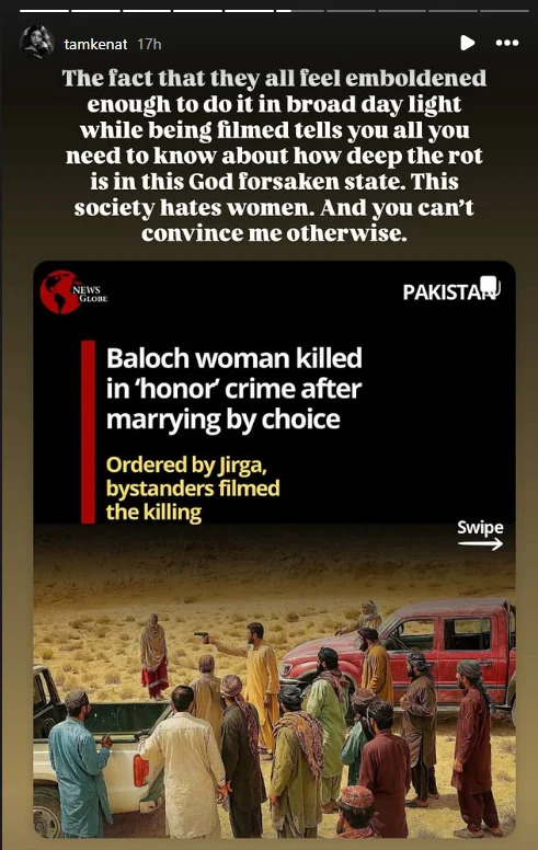 তমকেনাত মনসুরও এই হত্যাকাণ্ডে ক্ষোভ প্রকাশ করে বলেন, ‘এই সমাজ নারীদের ঘৃণা করে।’ বেলুচিস্তানের ঘটনাকে কেন্দ্র করে এ মন্তব্য সামাজিক যোগাযোগমাধ্যমে ব্যাপক আলোচনার জন্ম দেয়।