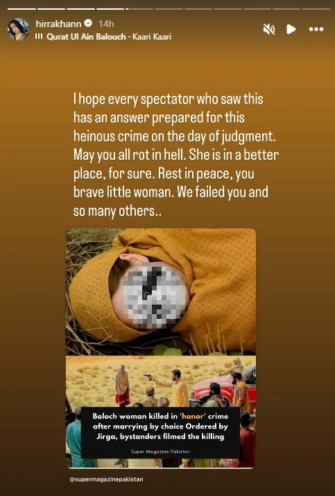 মডেল হিরা খান নিহতদের জন্য প্রার্থনা করে তার বার্তায় উল্লেখ করেন, ‘আমরা তোমাদের এবং আরও অনেককে ব্যর্থ করেছি,’ যা দেশে ক্রমবর্ধমান সম্মান রক্ষার নামে হত্যাকাণ্ডের সংখ্যা বৃদ্ধির বাস্তবতাকে সামনে আনে।