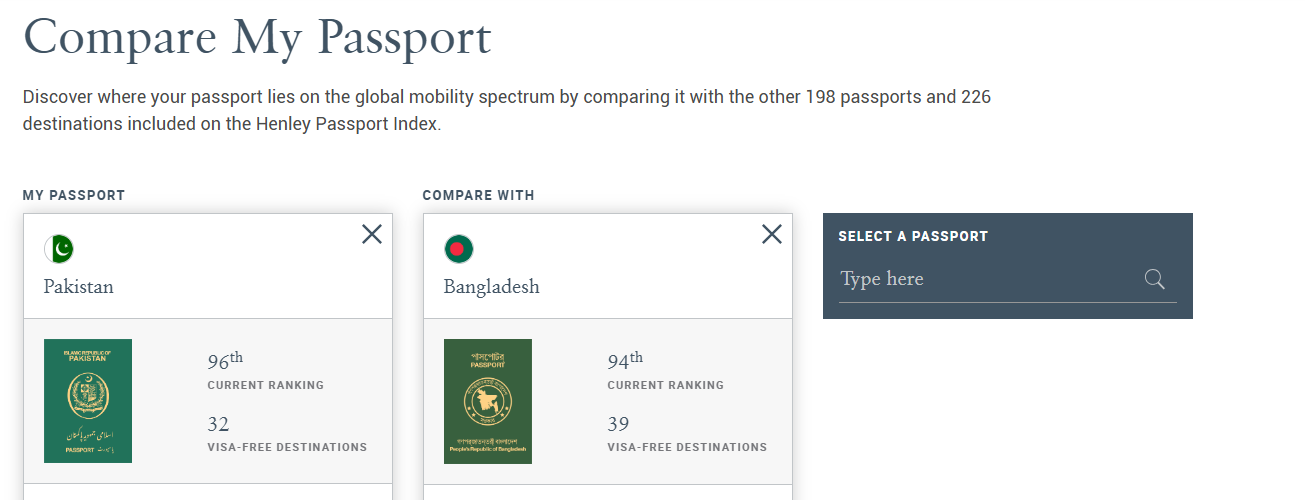পাকিস্তানি পাসপোর্টধারীরা ৩২টি দেশে ভিসা ছাড়া ভ্রমণ করতে পারবে। এশিয়ার অন্যান্য দেশের তুলনায় বাংলাদেশের অবস্থান দুর্বল হলেও পাকিস্তানের তুলনায় কিছুটা ভালো অবস্থানে রয়েছে।