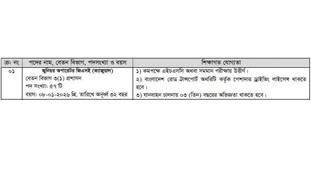 বয়স: ৮ জানুয়ারি ২০২৬ তারিখ সর্বোচ্চ ৩২ বছর। এসএসসি পাসের সনদপত্রের ভিত্তিতে বয়সসীমা নির্ধারণ করা হবে।