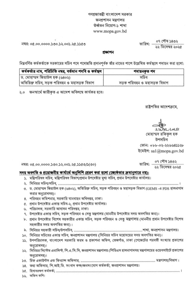 জিয়াউল হককে সড়ক পরিবহণ বিভাগের সচিব পদে পদোন্নতি