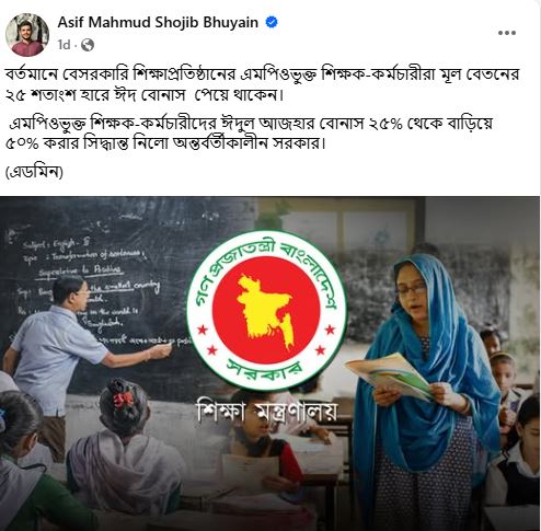 পোস্টে ঈদুল আজহার বোনাস ২৫ শতাংশ থেকে বাড়িয়ে ৫০ শতাংশ করার অন্তর্বর্তী সরকারের সিদ্ধান্তের
