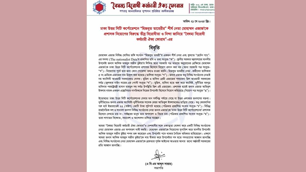 নির্বাচন কমিশন নয়, উপদেষ্টা পরিষদ পুনর্গঠনের দাবি জানিয়েছে বৈষম্যবিরোধী কর্মচারী ঐক্য ফোরাম।