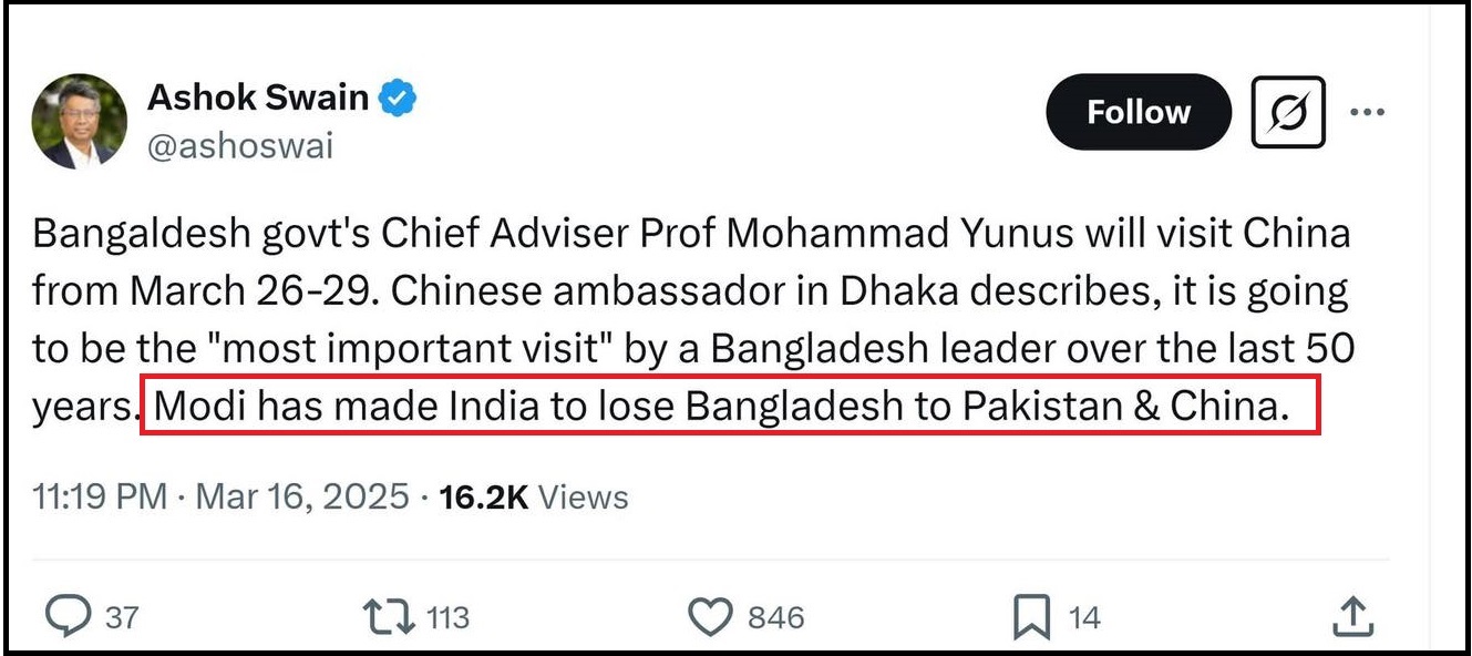 চলতি বছরের মার্চে অধ্যাপক সোয়াইন এক টুইটে লিখেছেন, ‘মোদি হ্যাজ মেইড ইন্ডিয়া টু লুজ বাংলাদেশ টু পাকিস্তান এন্ড চায়না’ (বাংলাদেশ ইস্যুতে চীন ও পাকিস্তানের কাছে মোদি ভারতকে হারিয়েছেন)। ৫ আগস্টের পর শেখ হাসিনার নেতৃত্বাধীন আওয়ামী লীগ সরকারের পতনের পর বাংলাদেশ-ভারত দ্বিপাক্ষিক সম্পর্ক সাম্প্রতিক সময়ে সবচেয়ে অবনতিশীল পর্যায়ে পৌঁছে। হাসিনার প্রত্যার্পণ, সংখ্যালঘু ইস্যু, সীমান্ত উত্তেজনা, ট্রান্সশিপমেন্ট সুবিধা প্রত্যাহার, পানিবণ্টনসহ একাধিক ইস্যুতে দুই প্রতিবেশী দেশের মধ্যে আস্থার সংকট ক্রমশ বেড়েছে।