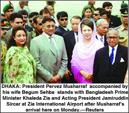 এমন ‘উত্তপ্ত পরিস্থিতিতে’ মোশাররফকে স্বাগত জানাতে বিমানবন্দরে হাজির হন তৎকালীন ভারপ্রাপ্ত রাষ্ট্রপতি জমিরউদ্দীন সরকার ও প্রধানমন্ত্রী খালেদা জিয়া। ১৯৭১ সালের স্বাধীনতা পরবর্তী এটি ছিল কোনো পাকিস্তানি সরকারপ্রধানের চতুর্থ সফর। বিমানবন্দরে বাজানো হয় দুই দেশের জাতীয় সংগীত। বাংলাদেশে এসে ওই দিনই ঢাকার উপকণ্ঠে সাভারের জাতীয় স্মৃতিসৌধে ১৯৭১ সালের মহান মুক্তিযুদ্ধে শহীদ জাতির শ্রেষ্ঠসন্তানদের শ্রদ্ধা জানাতে যান। সেখানে স্মৃতিসৌধের পরিদর্শন বইয়ে মোশাররফ ‘দুঃখপ্রকাশ’ করেন।