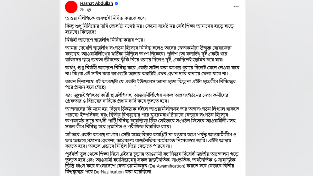 জাতীয় নাগরিক পার্টির (এনসিপি) দক্ষিণাঞ্চলের মুখ্য সংগঠক হাসনাত আবদুল্লাহ বলেছেন, আওয়ামী লীগকে অবশ্যই নিষিদ্ধ করতে হবে কিন্তু শুধু নিষিদ্ধের দাবি তোলাটা যথেষ্ঠ নয়। কেন যথেষ্ট নয় সেই শিক্ষা আমাদের হাড়ে হাড়ে হয়েছে। কিভাবে? নির্বাহী আদেশে ছাত্রলীগ নিষিদ্ধ করার পরে।