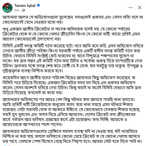 সামাজিক যোগাযোগ মাধ্যমে জাহানারার ওই অভিযোগ ইস্যুতে লম্বা এক মন্তব্য লিখেছেন তামিম। সেখানে তিনি লেখেন, ‘জাহানারা আলম যে অভিযোগগুলো তুলেছেন, সবগুলোই গুরুতর এবং সেসব সত্যি হলে তা কোনোভাবেই মেনে নেওয়ার মতো নয়। শুধু একজন জাতীয় ক্রিকেটার বা সাবেক অধিনায়ক বলেই নয়, যেকোনো পর্যায়ের ক্রিকেটার হোক বা যে কোনো খেলার ক্রীড়াবিদ কিংবা যেকোনো নারী, কারও প্রতিই এমন আচরণ কোনোভাবেই গ্রহণযোগ্য নয়।’