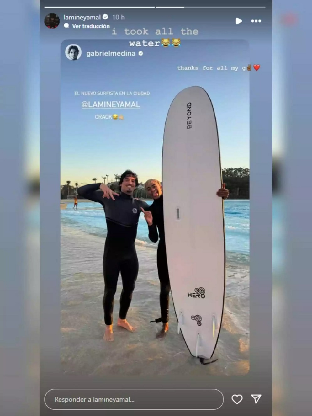 এত গুজব যখন চলছে, ইয়ামাল তখন ইতালি ছেড়ে ব্রাজিলে চলে এসেছে। বিখ্যাত সাফারিং তারকা গ্যাব্রিয়েল মাদিনার এক ছবিতে দেখা যায়, সাফারিং করছেন ইয়ামাল। একটি ছবিতে দেখা যায় ইয়ামাল সার্ফার বোর্ড ও পোশাক পরে পোজ দিচ্ছেন ইয়ামাল। ক্যাপশনে লেখা, শহরে নতুন সার্ফার। সেই ছবির স্কিনশট আবার নিজের স্টোরিতে দিয়েছেন ইয়ামাল।