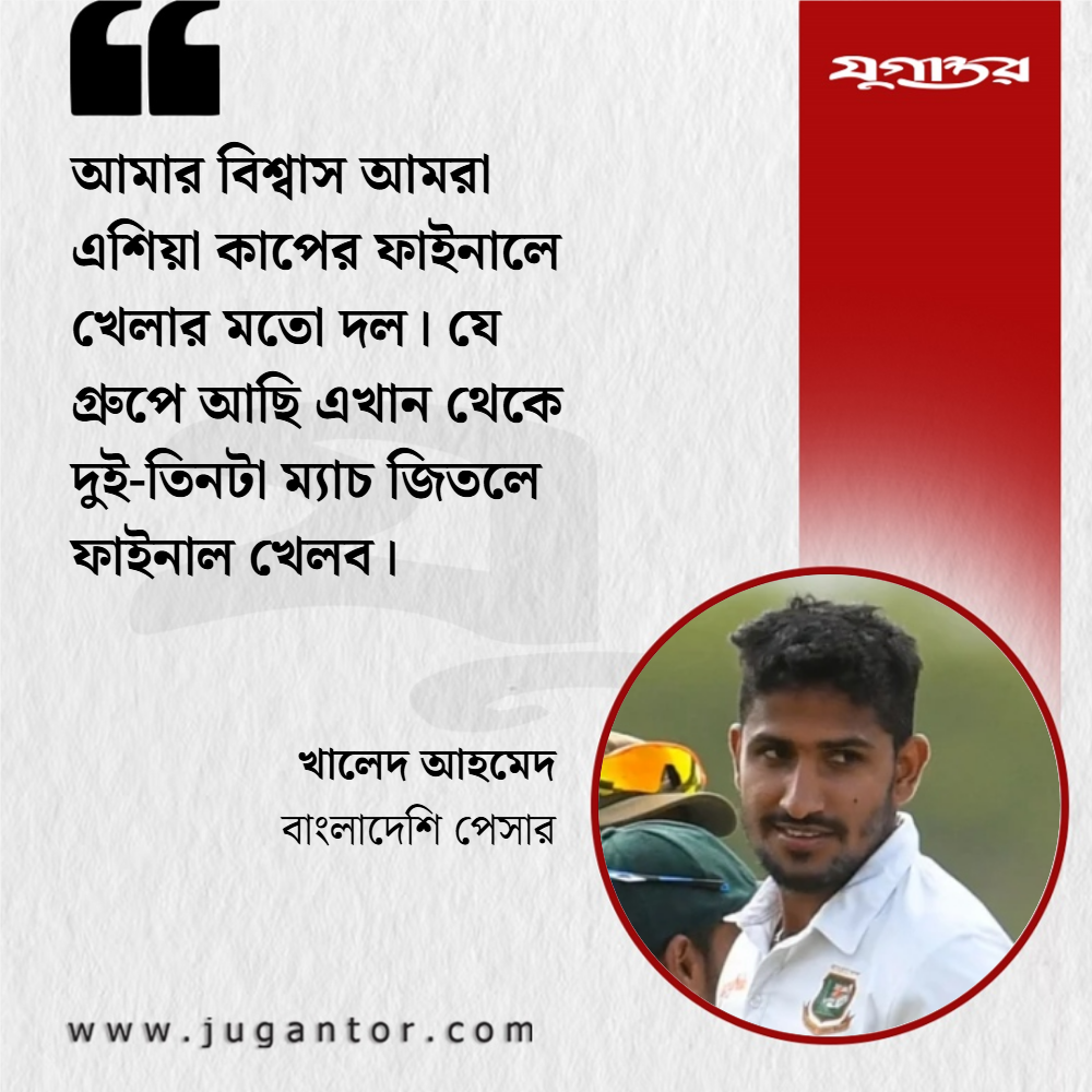 বাংলাদেশ দলের ডান-হাতি পেসার খালেদ আহমেদ মনে করেন, কঠিন গ্রুপে পড়লেও বাংলাদেশের ফাইনালে খেলার সুযোগ আছে। মিরপুর স্টেডিয়ামে বৃহস্পতিবার তিনি বলেন, ‘আমার বিশ্বাস আমরা এশিয়া কাপের ফাইনালে খেলার মতো দল। যে গ্রুপে আছি এখান থেকে দুই-তিনটা ম্যাচ জিতলে ফাইনাল খেলব।’