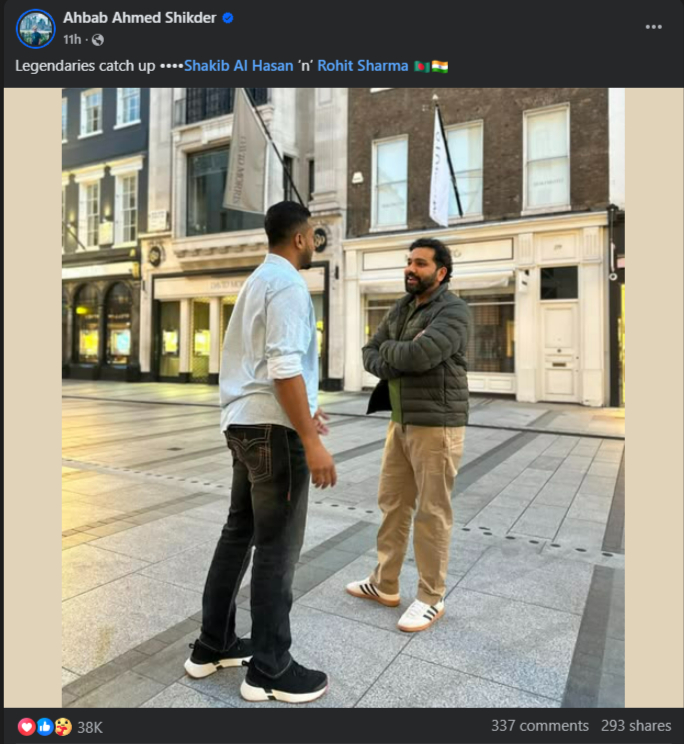 আহবাব আহমেদ শিকদার নামের একটি ভেরিফায়েড ফেসবুক আইডি থেকে সাকিব-রোহিতের ছবিটি পোস্ট করা হয়। ক্যাপশনে লেখা হয়, ‘লিজেন্ডারি ক্যাচ আপ, সাকিব আল হাসান এবং রোহিত শর্মা’।