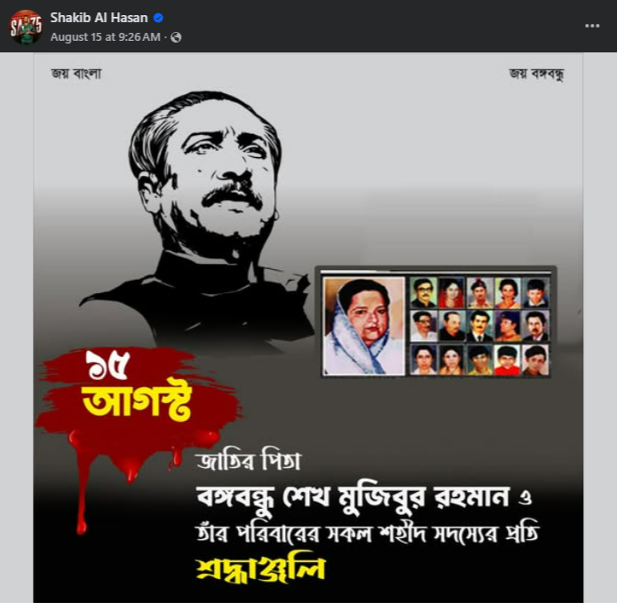 কিন্তু গত ১৫ আগস্ট তাদের সে ‘প্রচেষ্টায়’ যেন পানি ঢেলে দিলেন সাকিব নিজেই। সেদিন ফেসবুকে একটি ফটোকার্ড শেয়ার করেছেন তিনি। যেখানে শেখ মুজিবুর রহমানের ছবি ও তার পরিবারের সব সদস্যের ছবি দিয়েছিলেন। পোস্টে তিনি লিখেছেন, তার পরিবারের সব শহীদ সদস্যের প্রতি শ্রদ্ধাঞ্জলি।